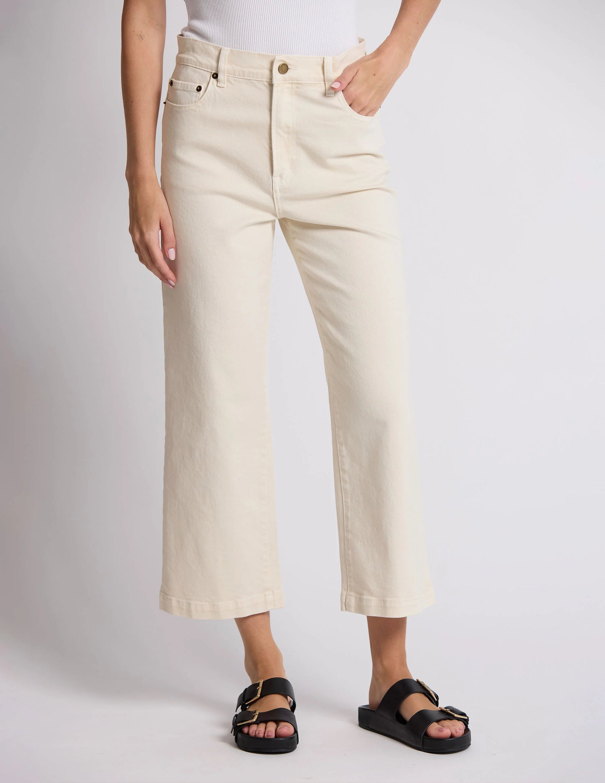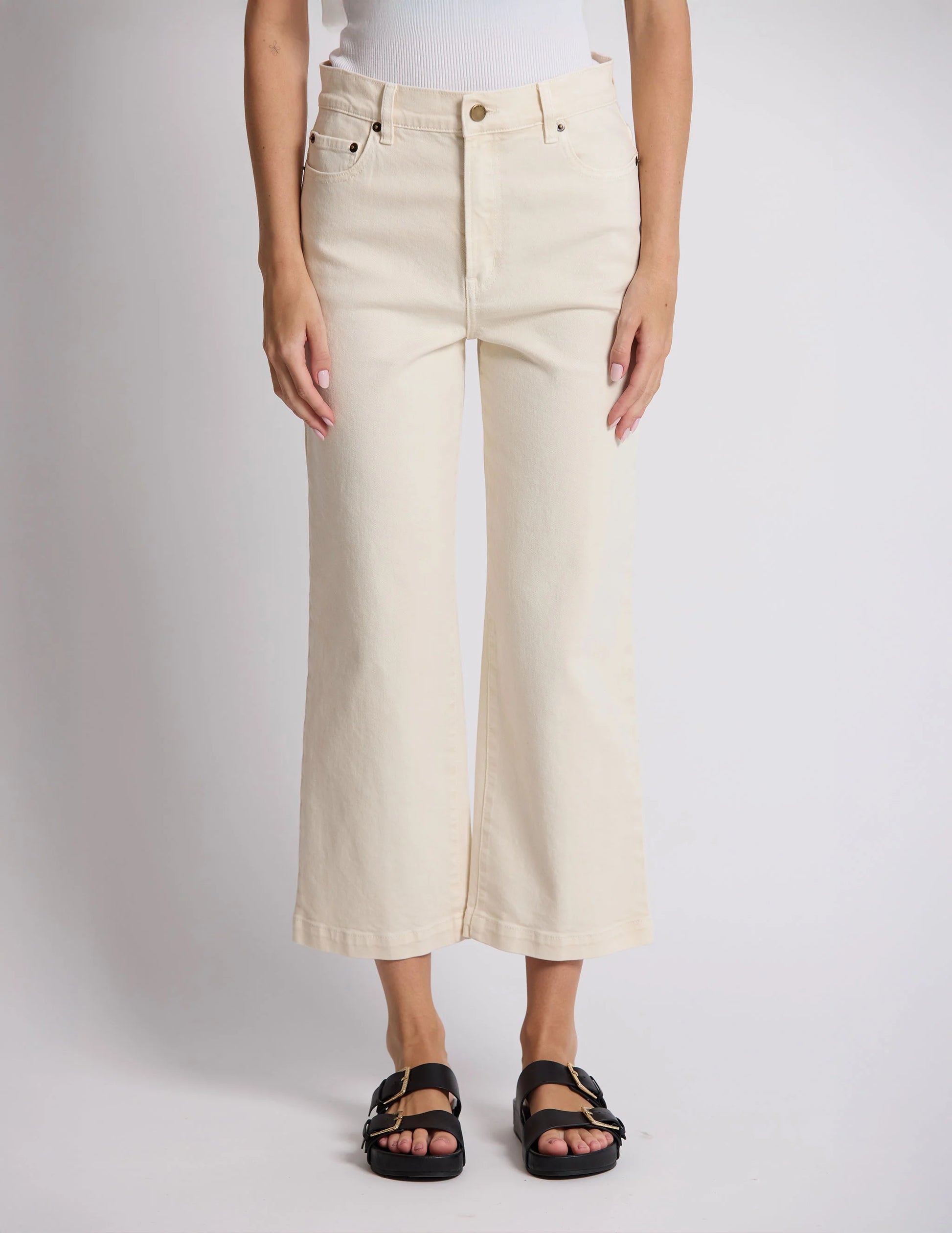 High waisted ankle length straight leg jeans in Ecru wash with antique silver hardware and logo patch on back waist